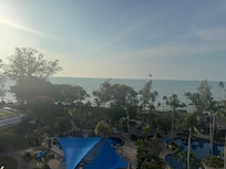 Be aware that the rooms facing the city have no balcony. We upgraded on check-in and had a lovely balcony looking over the pools and sea. The hotel wasn’t full so there were plenty of sunbeds and breakfast was quiet even at peak hour! Plenty of food choices and the staff were friendly. There is no beach access due to erosion but the grounds are fine and pools looked lovely. Plenty of places to eat and drink just outside the hotel so make sure you explore. Grabs are plentiful and it’s only a 10 min drive to the butterfly farm and Batik cultural factory.