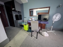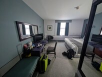 Check in was easy enough without a queue. The room was spacious with a comfortable bed. but the bathroom extractor did not work, The shower head was damaged and would only operate on very hot. There is no Aircon so this room so it would be stifiling in the summer. However we were situated by the fire door that banged most of the night with noisy guests using it.